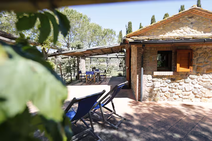 Upon arrival, you will enter your stone house, furnished in Tuscan style, with a double bed and a sofa bed in the living area. It has all the necessary comforts: air conditioning, free Wi-Fi, a fully equipped kitchen, a refrigerator, a wardrobe, a private bathroom with shower, toiletries, a hairdryer, an outdoor patio and a private garden.