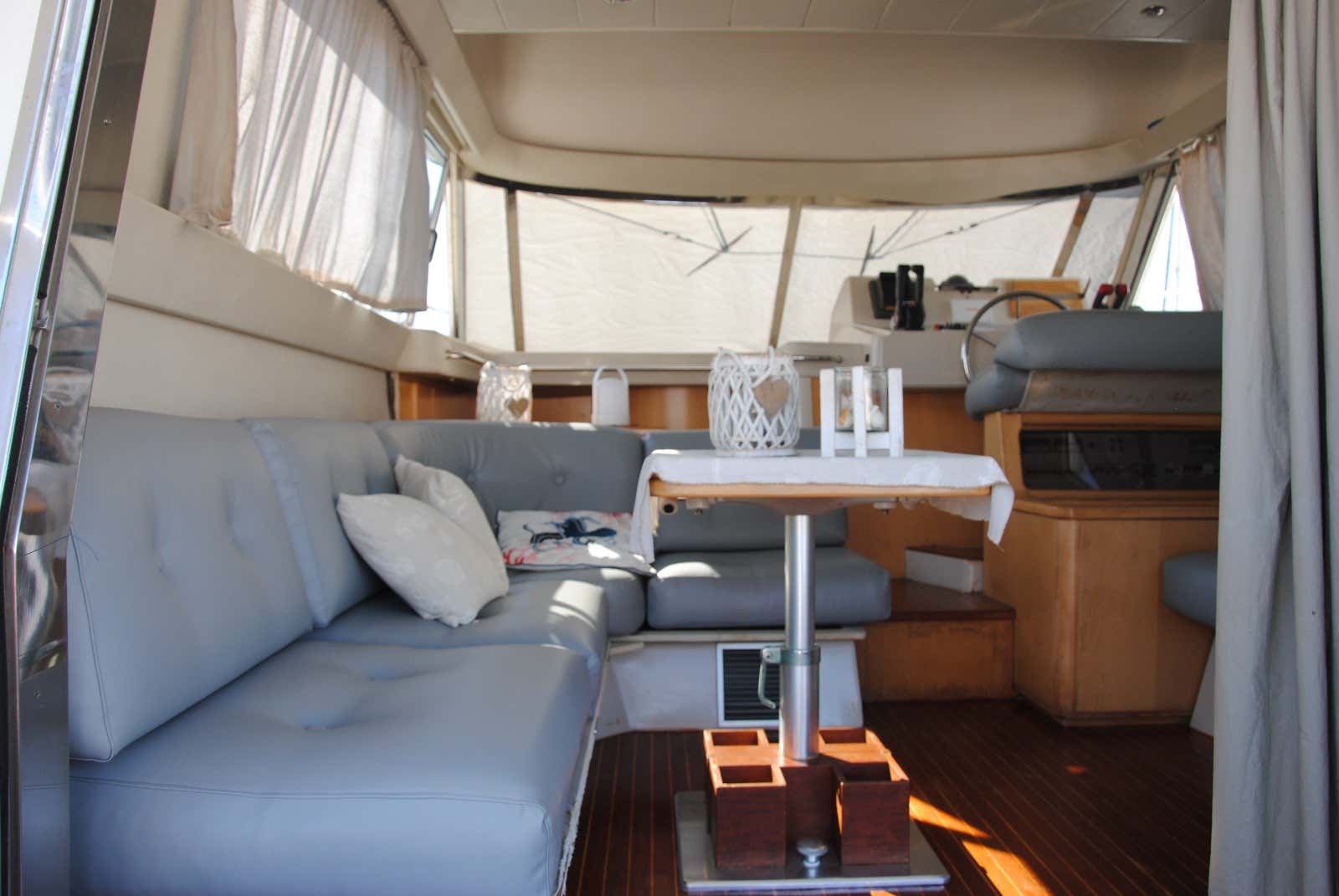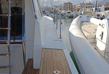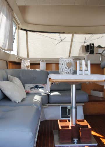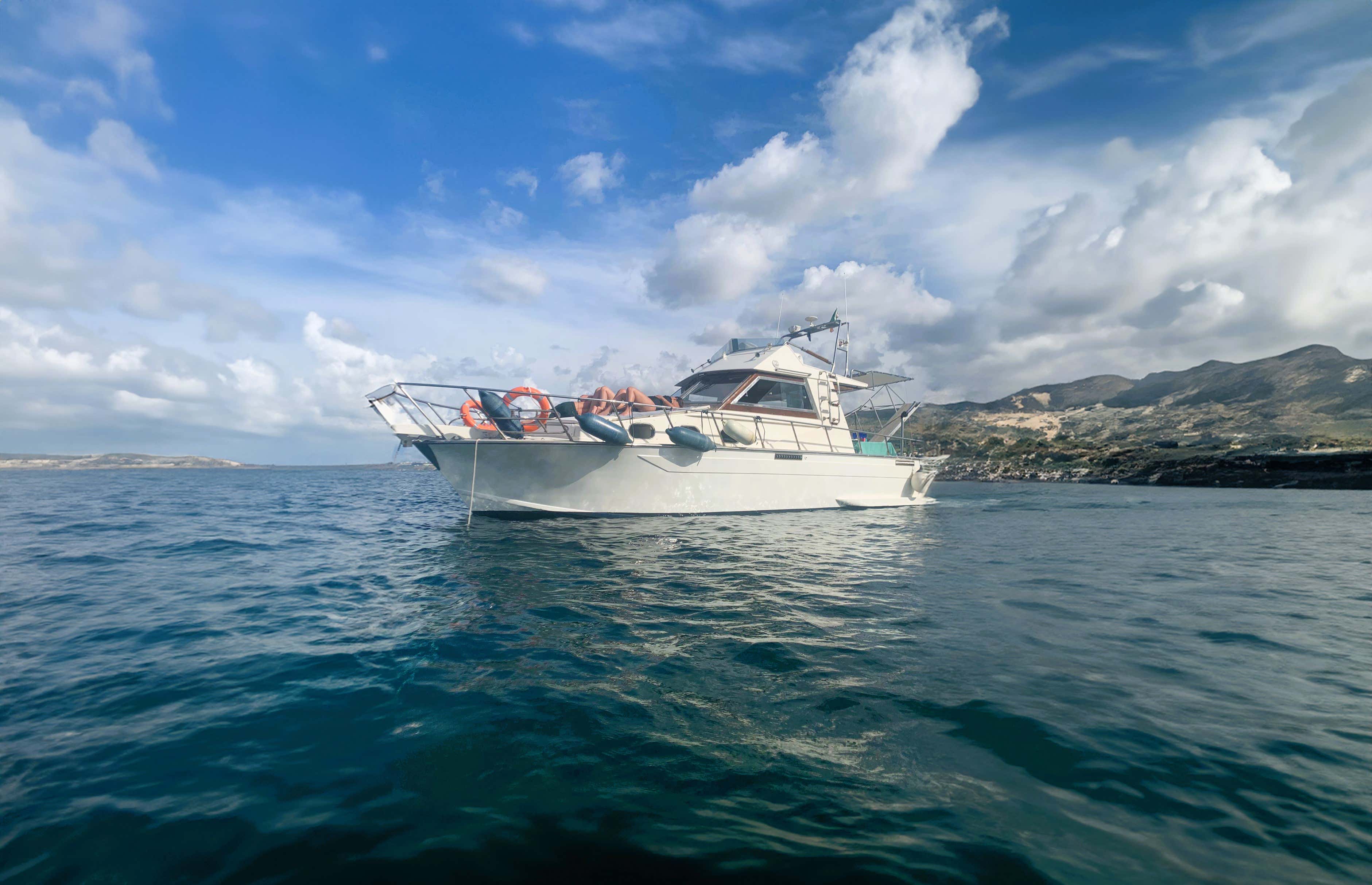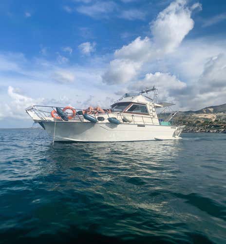 - a 14 m motor boat with a maximum capacity of 12 persons and equipped with awning, table and sofas, ladder, platform, freshwater shower, sundeck, dinghy and air conditioning.