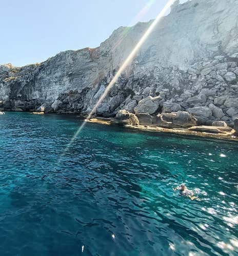 The first stop will be at the famous Grotta degli Innamorati in Favignana, where we will have our first swim, swimming in the crystal-clear waters inside the cave.