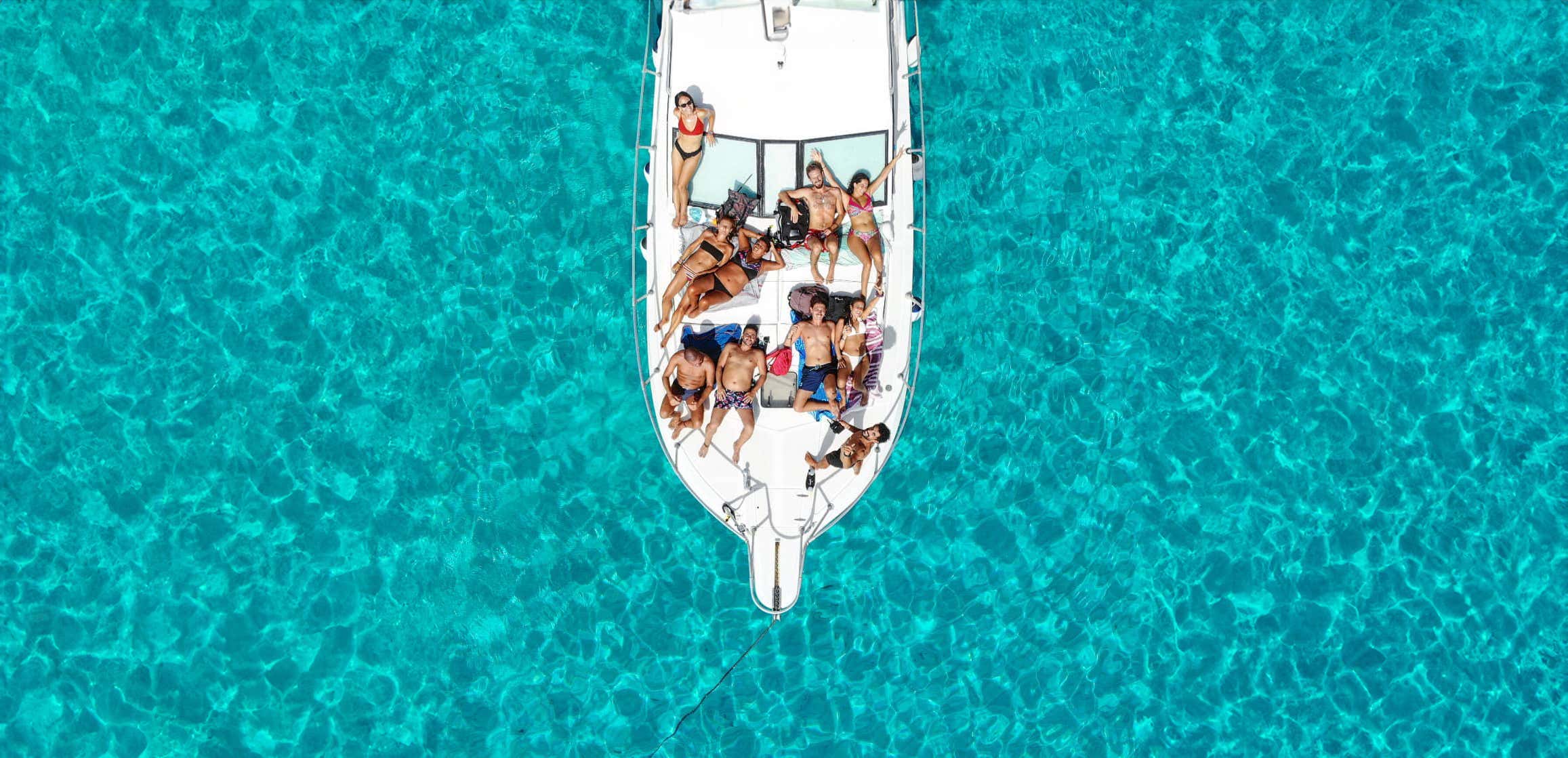 The boat is a 12-metre flybridge yacht, equipped with cushions, shower and toilet facilities, with a shaded deck area at the bottom and a sunshade awning at the top. Participants will find on board masks and fins for snorkelling and a SUP board to share.