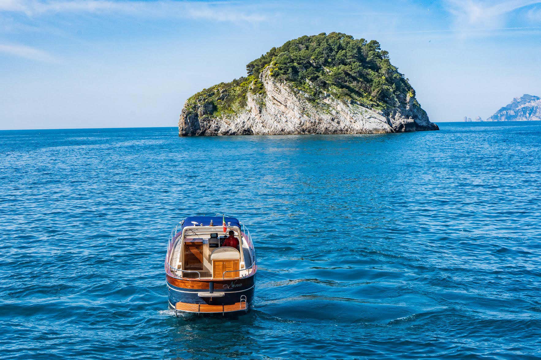 The boat is a 10-metre wooden gozzo approved for 12 people, equipped with a canopy, freshwater shower and toilet. It will be necessary to remain barefoot on board.