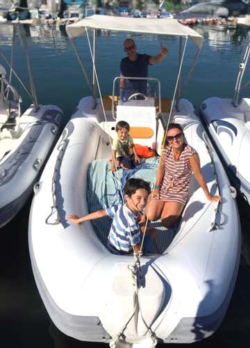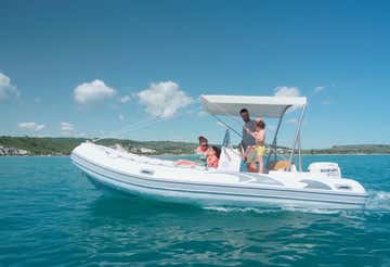 This is the "Predator" dinghy, 5.50 metres long and with a Suzuki 40-horsepower engine; it is equipped with an awning, climbing ladder and portable fridge. Remember to bring food and drinks on board to toast in company!