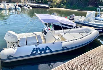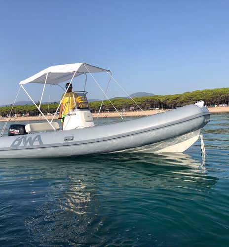 You will be driving a 5.50-metre-long BWA dinghy with a 40 HP engine and equipped with a sundeck, awning, and climbing ladder, perfect for accommodating up to 6 people on board in total comfort. You can also bring food and drinks on board and keep them cool with a cooler available on request.