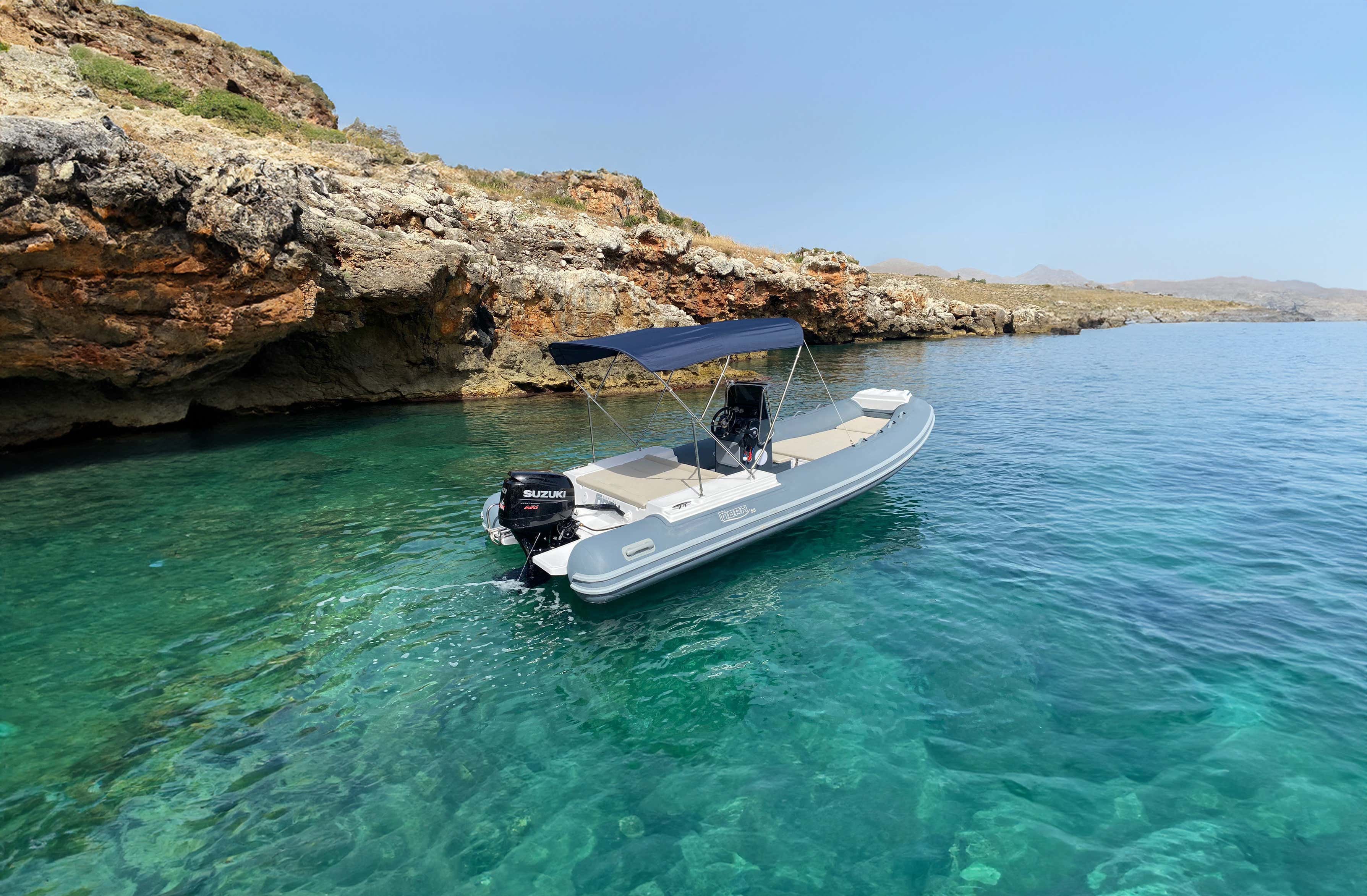 The boat is a 5.50 m long Noah 5.50 dinghy with a Suzuki 40 HP engine, equipped with a 30 litre fuel tank, life jackets, cushions, stern and bow sundeck, awning, climbing ladder, fresh water shower and Bluetooth stereo.