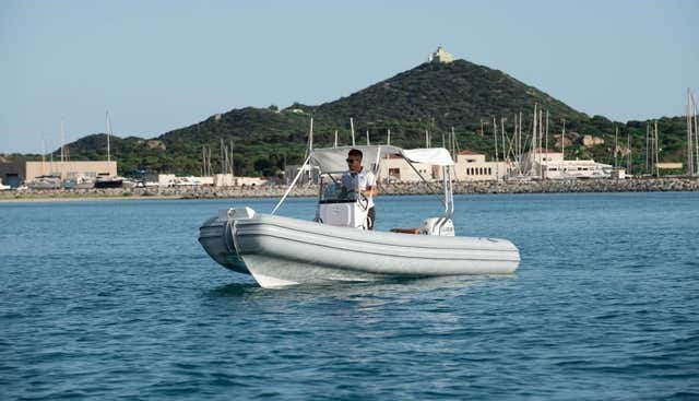 The boat available for hire is a 40 hpAt Marine At 59 dinghy , 5.90 metres long and equipped with an awning, ladder, stern sundeck, ice bag, deck shower, bow sundeck and stern platform.