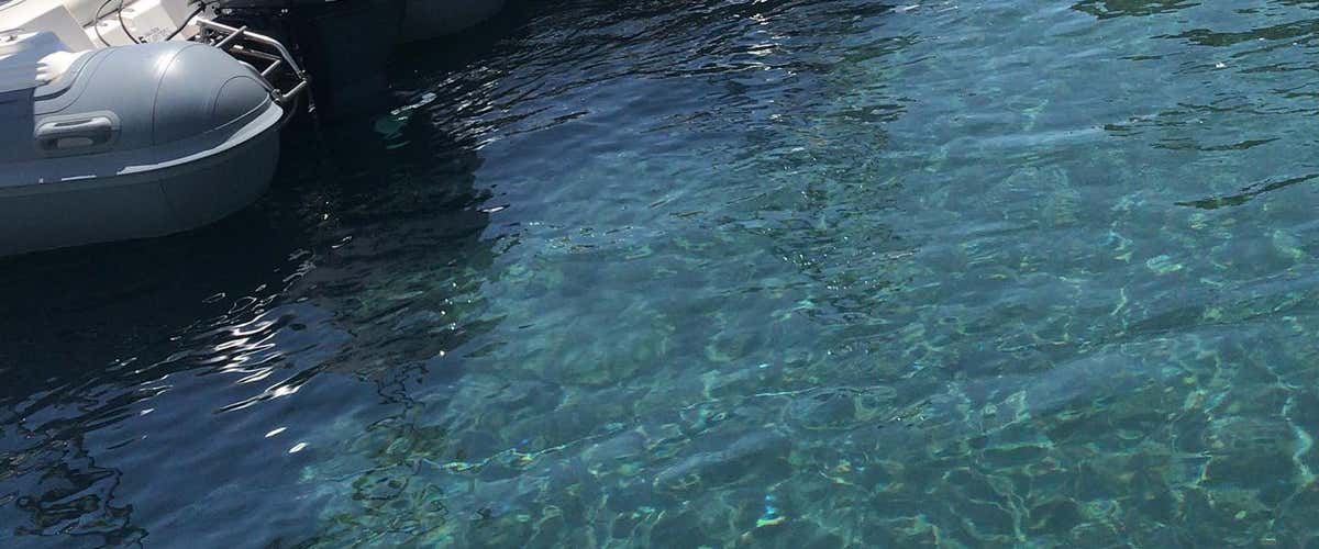 The dinghy, 5.80 metres long and powered by a 40 HP engine, is equipped with every comfort on board, including an awning to protect you from the sun, soft cushions for your relaxation, and a ladder that will make it easy and safe to get up from the water.