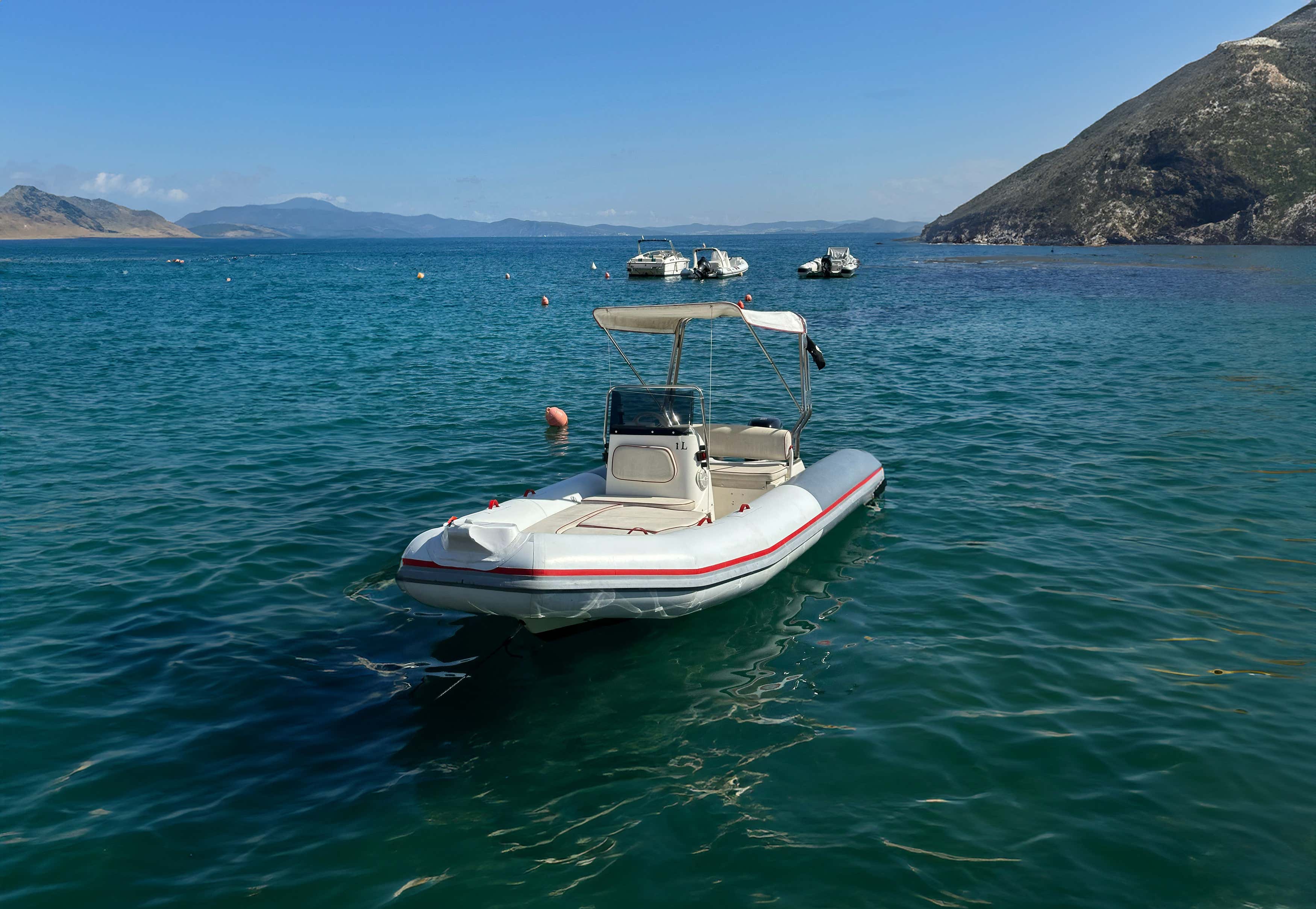 Upon your arrival, the hirer will hand over the boat to you: it is a Zodiac Madeline dinghy, 5.30 metres long with a Suzuki 40-horsepower engine and suitable for a maximum of 5 people; it is equipped with a sundeck at the bow and stern, awning, shower, and stereo system with speakers for you to enjoy yourself on board with your company at full volume! Remember to bring your own food and drinks.