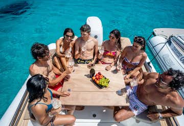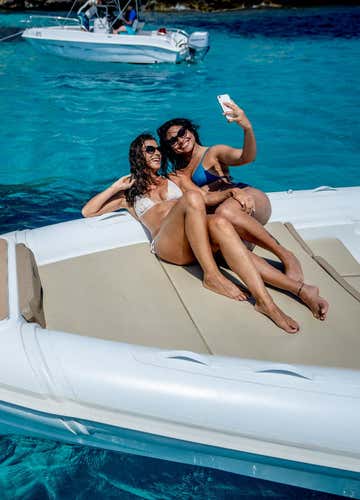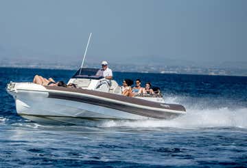 The 300/350 hp PAJARA RIBS 28 inflatable boat can accommodate up to 12 passengers. A sailing licence is not required as one of our skippers will be driving the boat, as well as at your disposal.