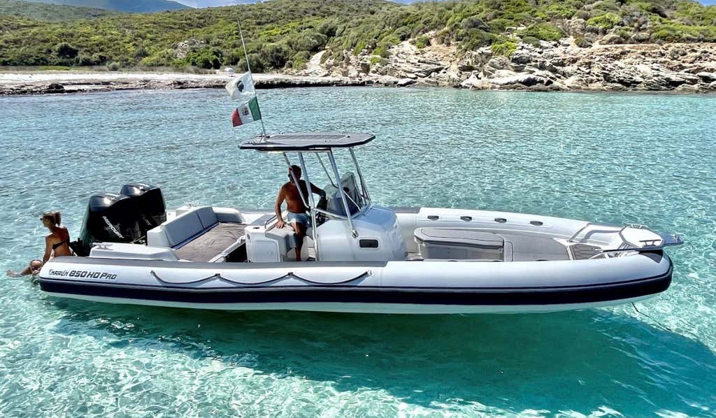 The boat used is a Marlin 850 HD PRO inflatable boat, 9 metres long and equipped with an awning, freshwater shower, refrigerator and stereo system. Sunscreen with 50+ protection is not allowed on board. Participants are asked to wear it before boarding.