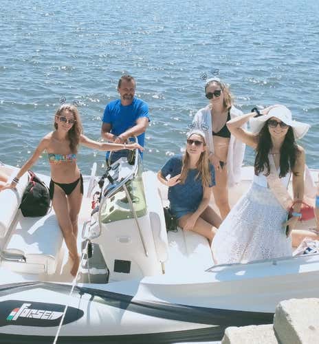 The boat is an inflatable boat model BWA 308 GTO, 9. 15 metres long, with a Honda V8 350 HP engine, equipped with all comforts, such as fridge, shower, awning, stereo, cushions and USB sockets. Shoes are not allowed on board, you remain barefoot. Dogs are not allowed on board.