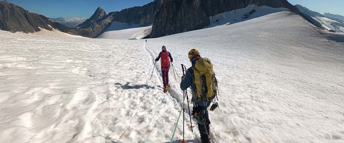 After a short briefing and the handover of the necessary equipment, you will ascend by cable car (not included) to Punta Helbronner and reach an altitude of 3, 400 metres in about 30 minutes. Once at the top, you will put on your crampon boots (not included) and experience the magnificent feeling of walking on a glacier.