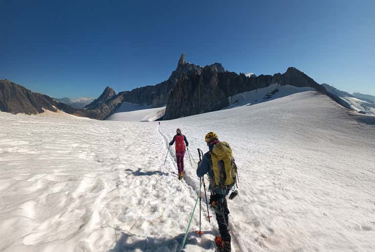 You will move safely between the crevasses, heading towards Col Flambeau and stopping occasionally to rest, listen to the guide's explanations and admire the landscape. In front of you, the magnificent view of Mont Blanc and the Dente del Gigante peak will stand out. Immerse yourself in such scenery and you will be thrilled!