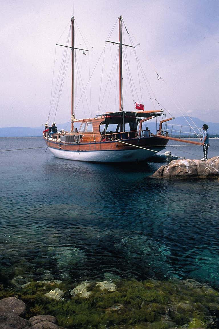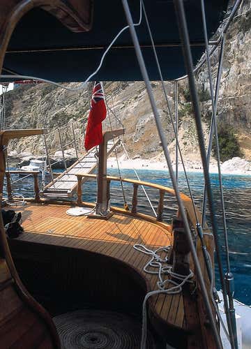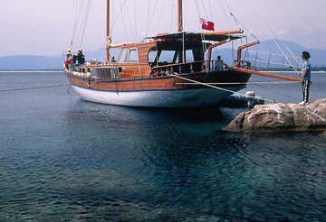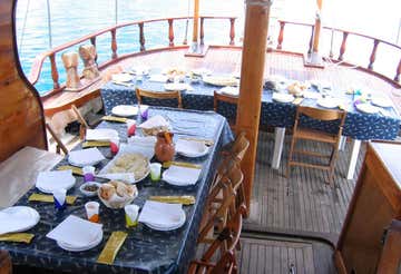 You will be on board a Turkish schooner of approximately 22 metres in length, built entirely of mahogany and equipped with bow cushions, sundeck, shaded sun deck, 5 cabins with 5 bathrooms, one of which is at the participants' disposal. Dogs are not allowed on board.