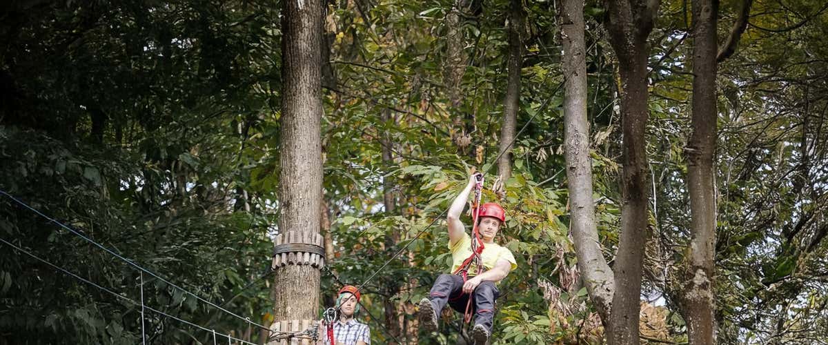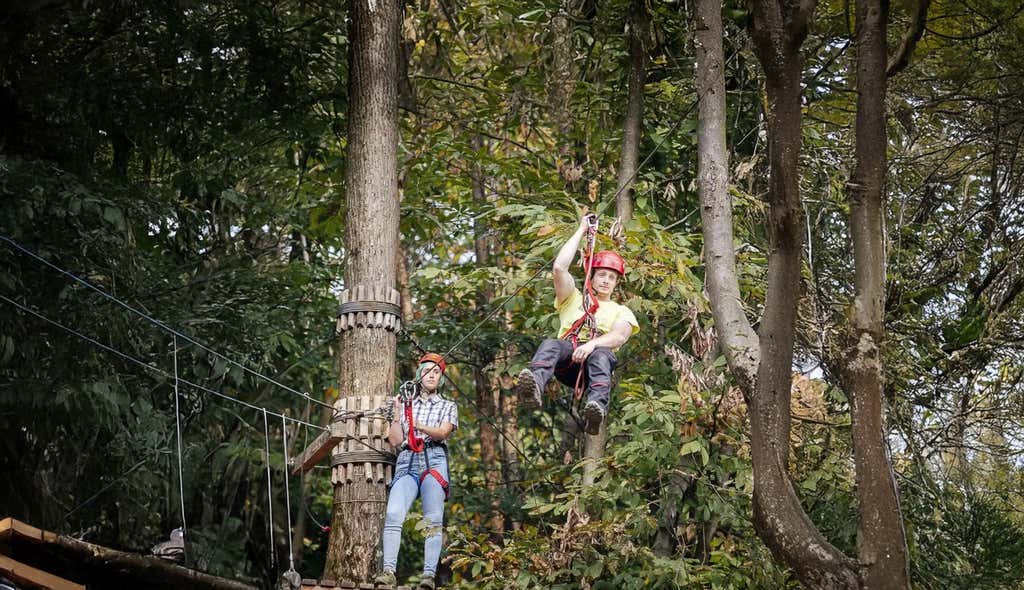 Entrance to the adventure park (included) can be either immediately after arrival or shortly before departure, depending on your preference. The organisers will hand over the equipment and explain the various routes available to you in about 20 minutes. You will then be free to choose your favourite. The red and brown courses require strength, dexterity and coordination while the blue course is suitable for those who want to have fun without challenging themselves too much.