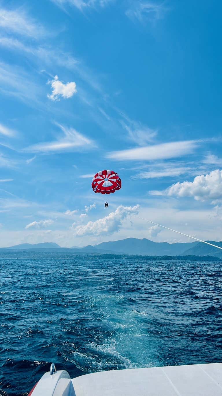 We will lift off, alone or in pairs, pulled by the force of the wind and the buoyancy of the boat, and begin our parasailing experience lasting about 11-13 minutes. It will be incredible to feel the air on our skin as we admire the beauty of Lake Garda from above.
