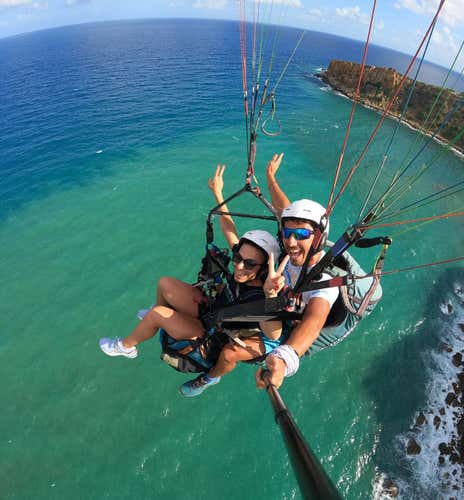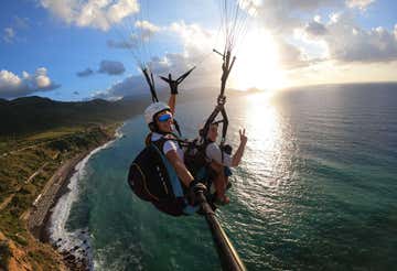 After about 15 to 20 minutes of flight time, we will land softly on the beach near the meeting point. The total duration of the experience is at least 1 hour, depending on the take-off area chosen, and includes transfer to the take-off point, pre-flight briefing and paragliding flight.
