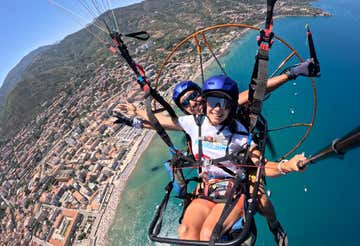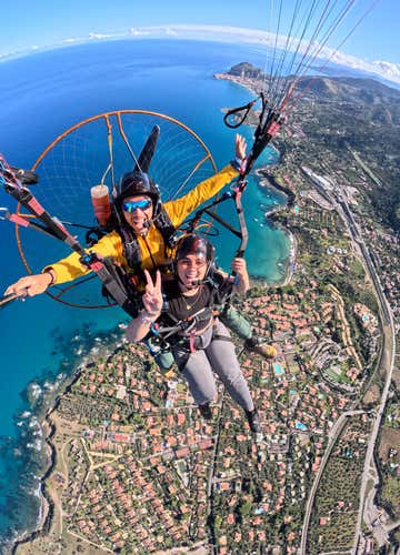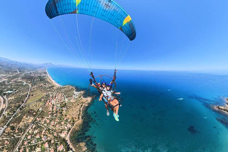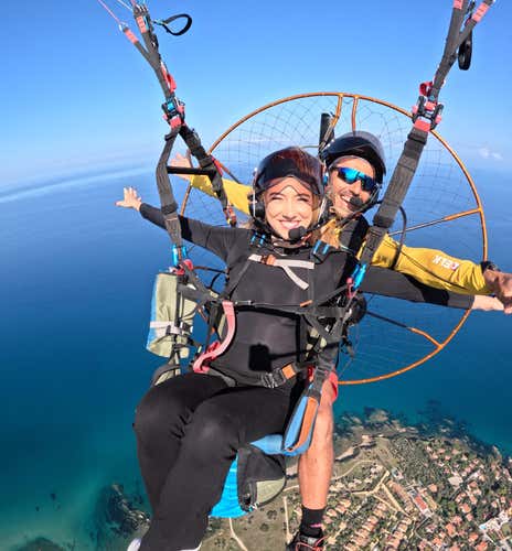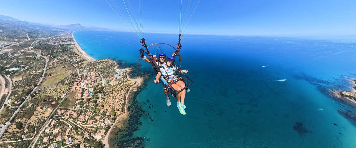 With the paramotor flight we take you up there, where the blue of the sea meets the blue of the sky. No launching into the void: we take off from the ground, climb to altitude thanks to the engine, and all you have to do is enjoy the show.