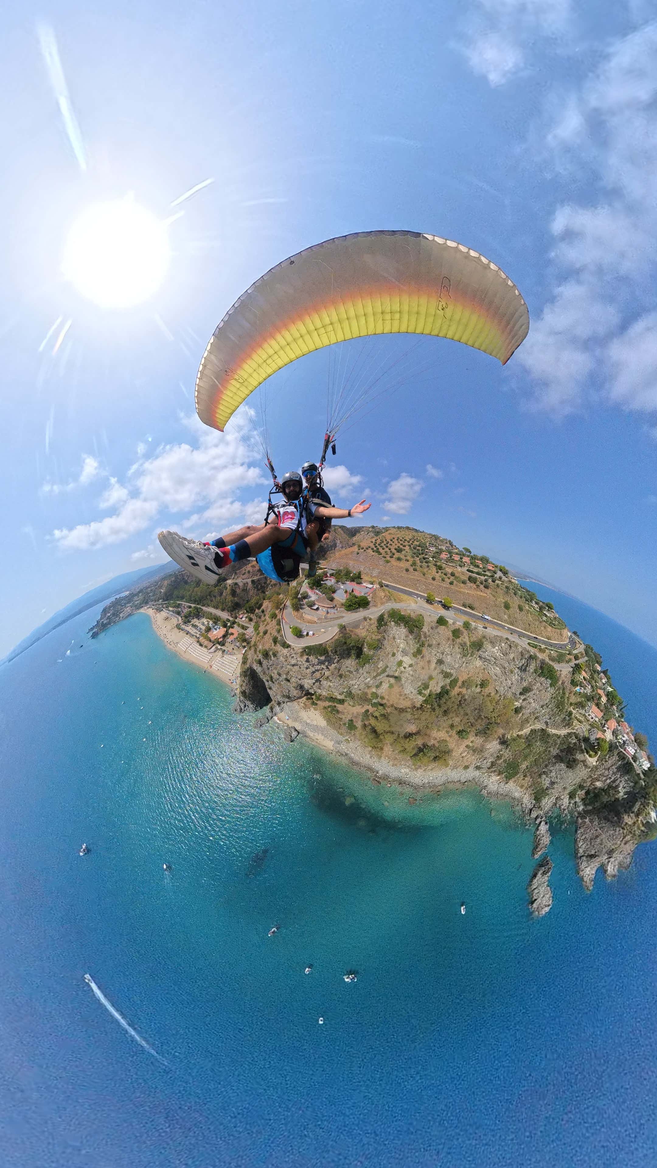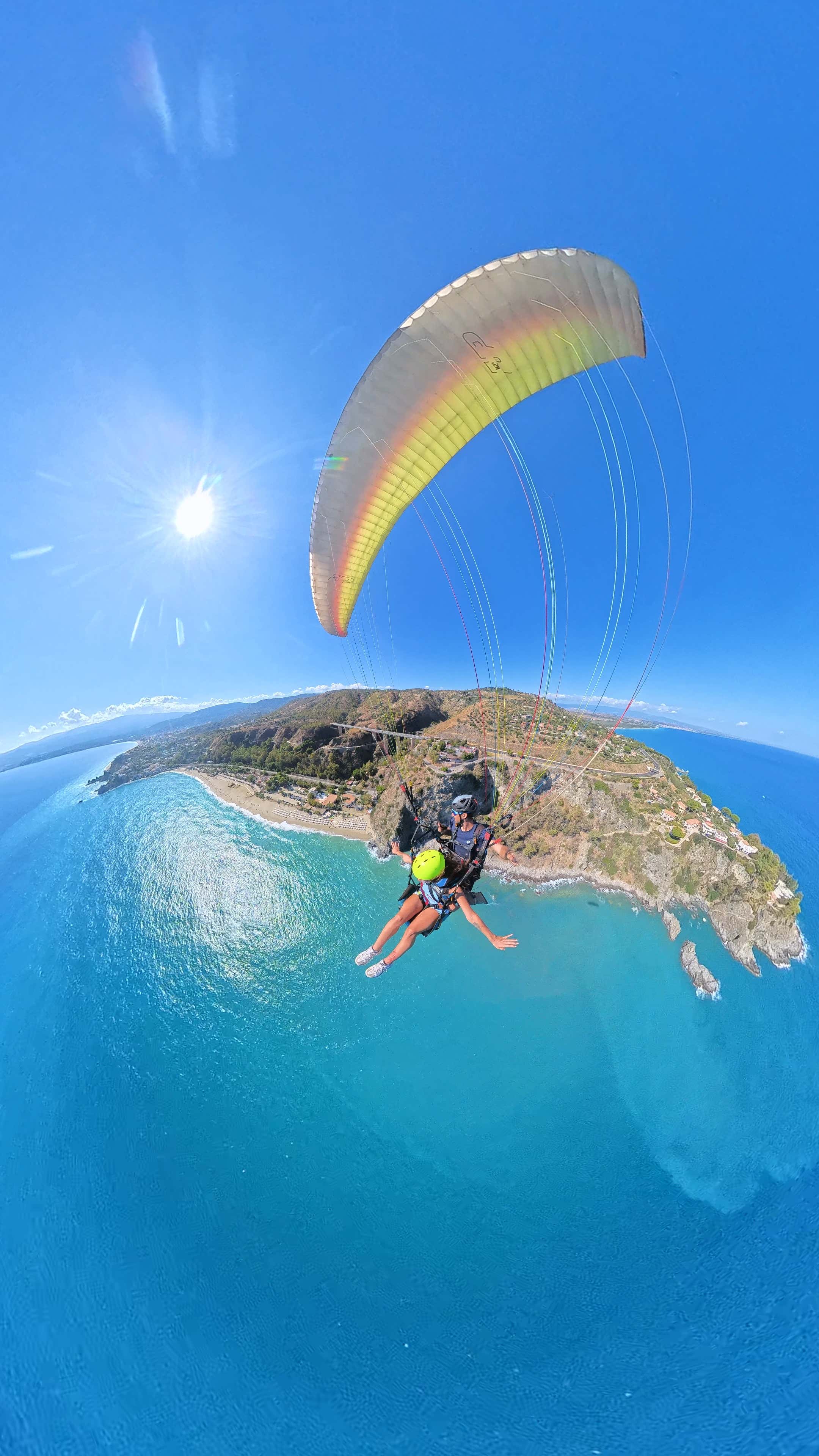 The flight lasts 10-15 minutes and follows the spectacular Ionian cliff, offering a privileged view of the Grotta di San Gregorio, the turquoise sea and the beaches of Caminia. The flight is panoramic, with some gentle manoeuvres that add a pinch of excitement without ever losing the feeling of lightness.