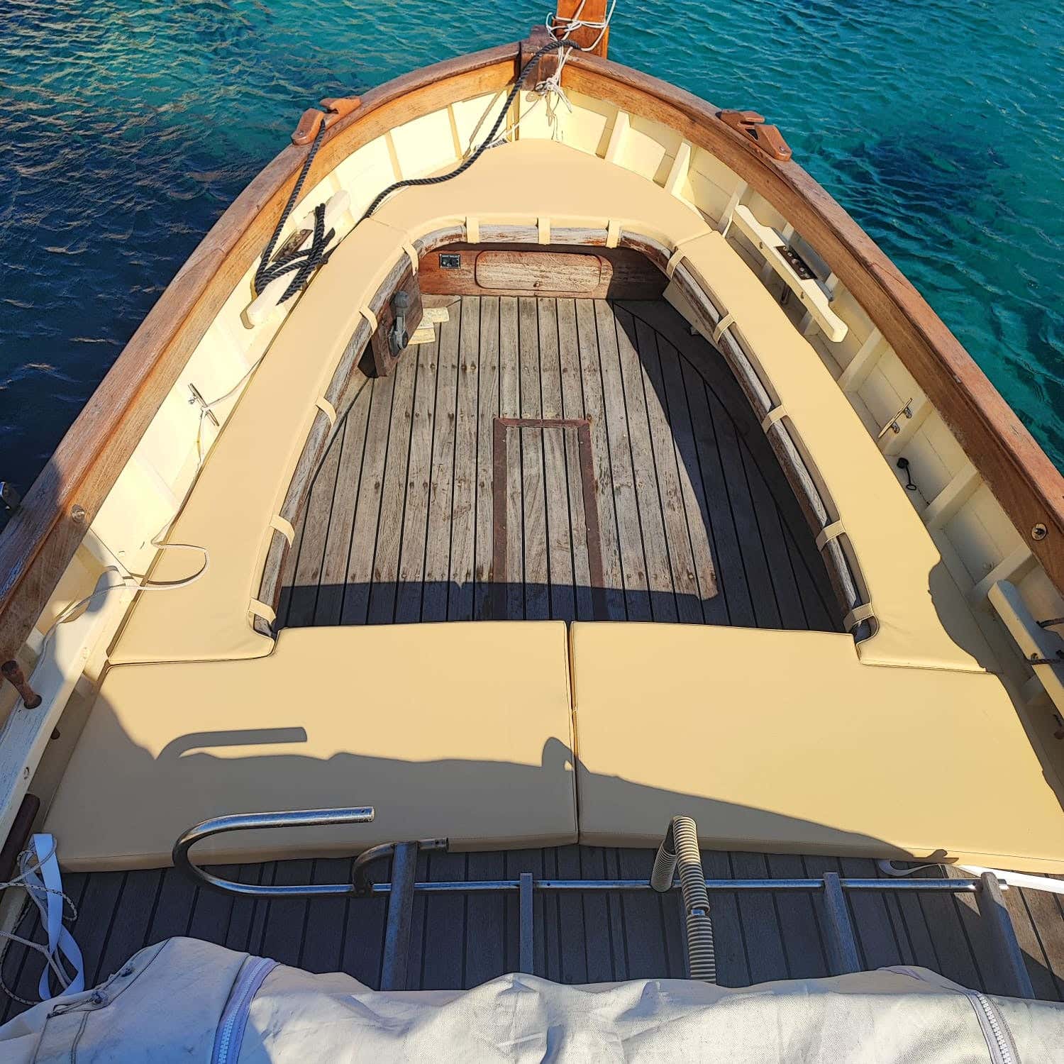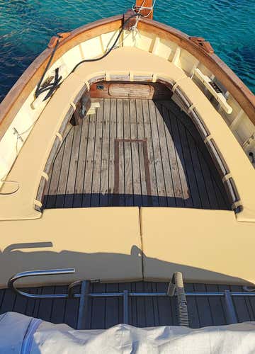 Theboat is a 9.5-metre-long wooden gozzo equipped with an inside cabin, sundeck, awning, shower and ladder. No shoes are allowed on board the boat, you remain barefoot. Dogs are allowed on board subject to notification of their presence by contacting the skipper at the contact details given in the booking confirmation e-mail.