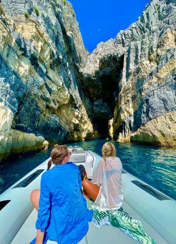 The boat used is an 8-metre Ranieri dinghy, equipped with a 200 hp engine, awning, freshwater shower, climbing ladder and cushions. On board you can stay without shoes.