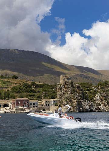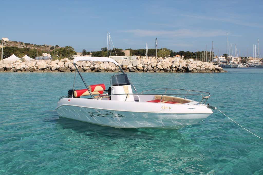 You will be on board a 5.70 m motor boat, equipped with comfortable sunbathing area at the bow, a comfortable driver's bench, sofa at the stern, fresh water shower, refrigerator box, and awning to protect you from the scorching Sicilian sun. The boat does not require a licence and is equipped with a fuel-efficient 4-stroke engine.