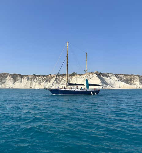 After an initial welcome, we will be taken on board the boat, a 16-metre sailboat equipped with every comfort! We will then begin theadventure by sailing towards the Scala dei Turchi, a magnificent white marl cliff that juts out from the coast and falls sheer into the sea. On the way, we can admire the Valley of the Temples and stop for 30 minutes near Porto Empedocle for some snorkelling.