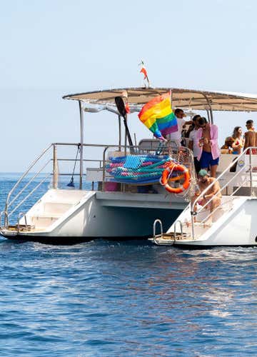 The boat is a 12-metre long and 5-metre wide catamaran , equipped with a net, shaded area, ladder, toilet, floating tubes, 2 SUP boards, snorkelling kit, safety equipment, armrests and freshwater shower.