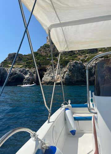 The boat is a 5.70 metre long Blue Line motorboat with a 40 HP engine. On board there are life jackets, Bluetooth system, awning, safety equipment, map of the Zingaro Nature Reserve, 2 snorkelling kits, float tubes, climbing ladder, GPS and anchor.
