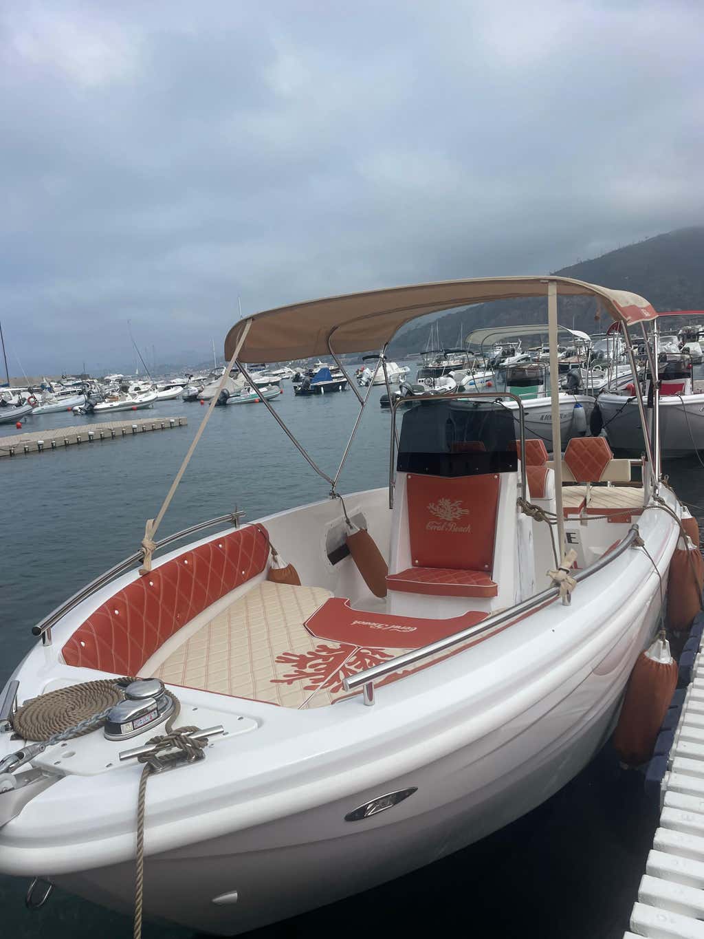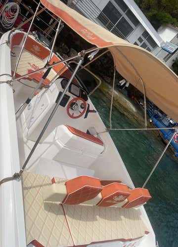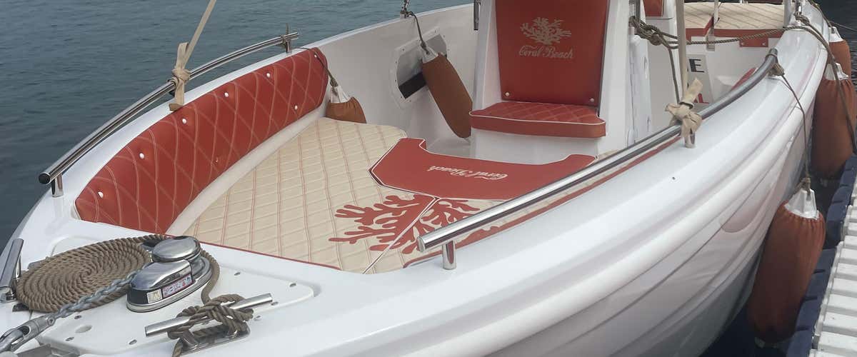 The boat is a 6 m longCoral Beach motorboat with a 40 HP engine, equipped with a freshwater shower, USB socket, Bluetooth stereo and double awning.