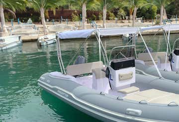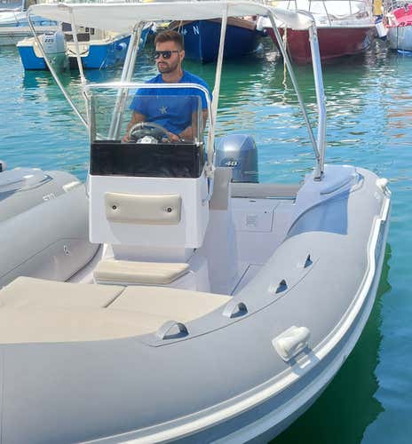 The boat is a 6 m long dinghy with a 40 hp engine. It is also equipped with a large sundeck with cushions, central steering, awning, climbing ladder and safety equipment.