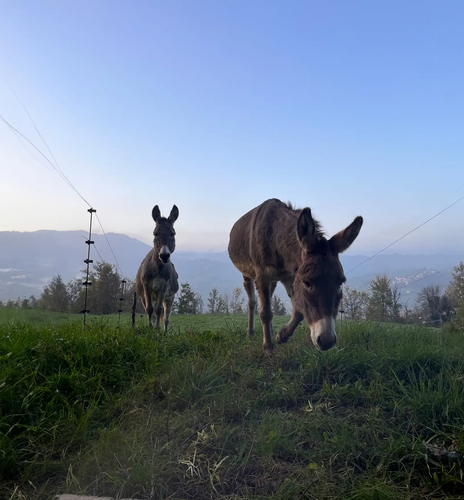 You will walk through woods and pastures, leading the donkeys by the harness and enjoying breaks for photos and cuddles. Once back, you will greet them and a snack (included) of cake, scones, salami and typical cheeses will be waiting for you. The experience will last about 3 hours in total.