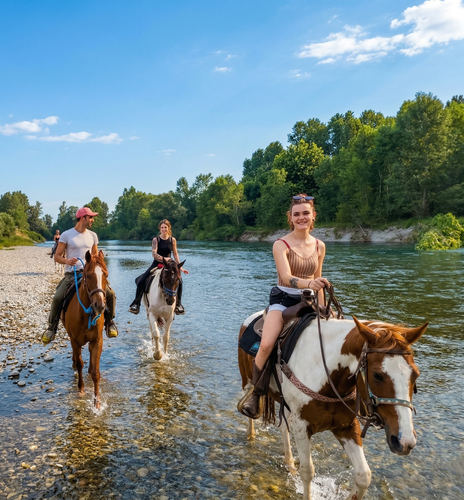 And here we are ready for our horseback ride: we will venture into the Oglio Nord Regional Park, riding on the banks and entering the river when temperatures allow. We will reach the scenic Soncino Castle, where we will enter the moat and pass under the drawbridge (as in the film Ladyhawke); along the way we will also encounter ancient mills dating back to 1800. The guide will lead the group on horseback, recounting anecdotes and curiosities about the area.