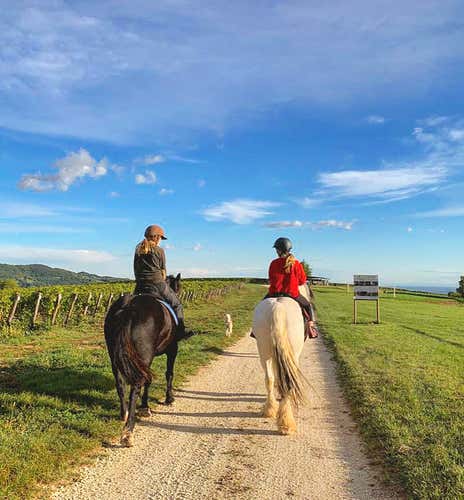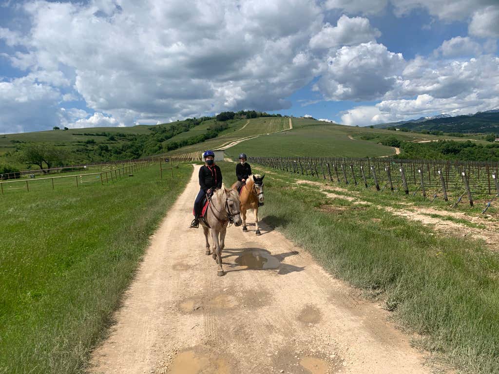 Then our horseback ride will begin: we will venture into the hills surrounding the riding school, dotted with vineyards. The scenic route, mainly on dirt roads, will give us a view of the Po Valley, the Lessinia mountains, and the city of Verona. Riding in this natural setting, just a few kilometres from the city, will steal your heart!
