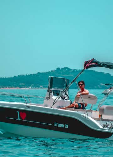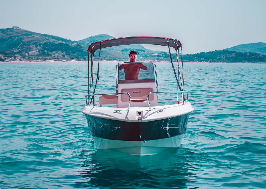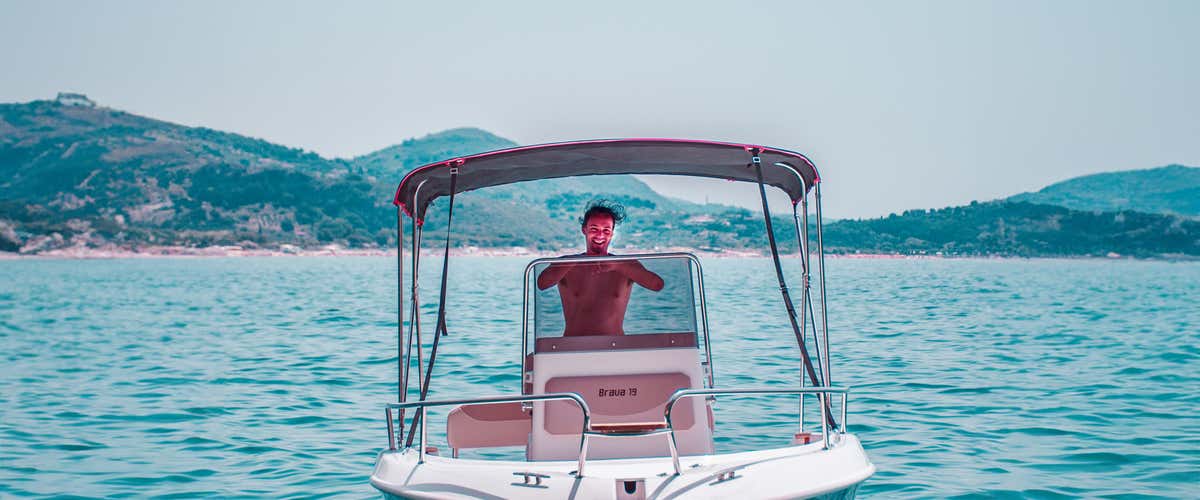 The boat is the Mingolla Brava 19 motorboat, 6 metres long and with a 40 HP engine; it is equipped with an electric starter, steering console, sundeck, awning, shower, stereo system, and a cooler to store food and drinks that you will want to take on board.