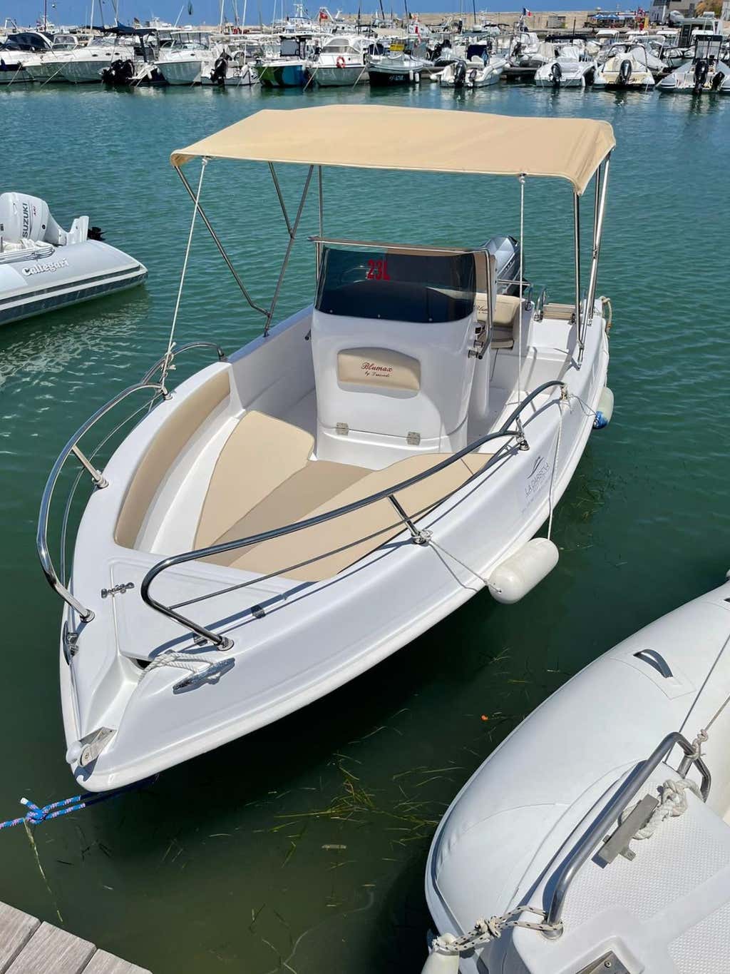 This is the "Blumax 19" motor boat, 5.50 metres long and with a Yamaha 40-horsepower engine; it is equipped with a large sundeck, awning, climbing ladder and portable fridge on request, to store food and drinks brought on board.