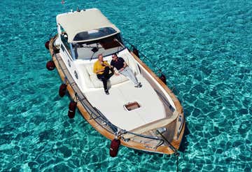 The boat is a semi-cabin motorboat Apreamare 10 m long, 3.50 m wide, 2 300 HP engines, equipped with a toilet, stereo system, swim ladder, cushions, awning and icebox.