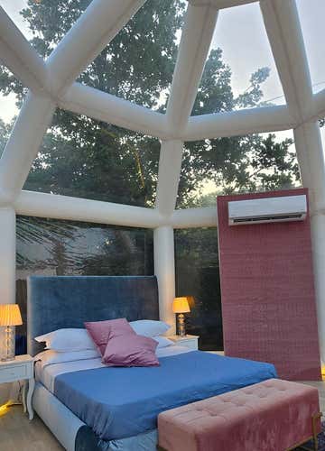 You will stay in the Bubble Moonlight, immersed in the woods and secluded to guarantee maximum privacy and tranquillity. It is a suite in the shape of a transparent dome, equipped with a double bed, a French sofa bed for two more guests, a private en-suite bathroom with toilet, washbasin and shower, air conditioning, heating, mini-bar, kettle, coffee machine, crockery, fine linen, towels and herbal teas. Outside, the furnished private garden will invite you to relax.