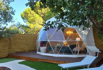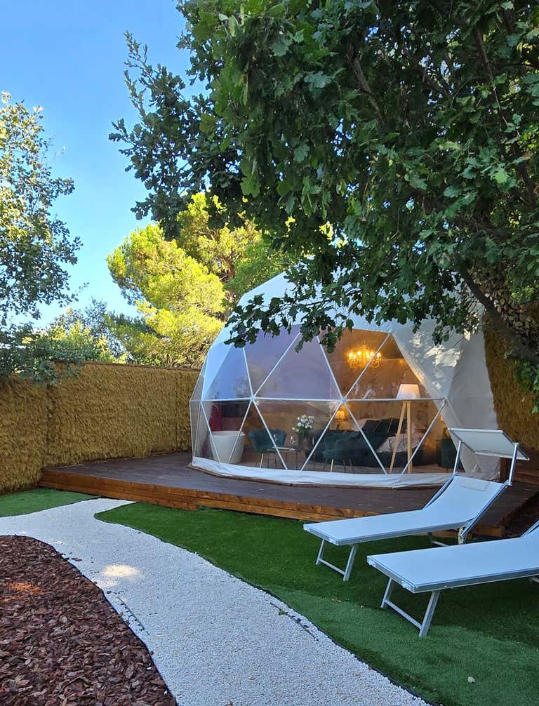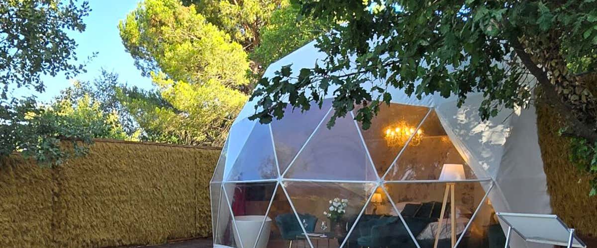 You will stay in a Bubble Star Dome, immersed in the forest and isolated to guarantee you maximum privacy and tranquillity. It is a suite in the shape of a geodesic dome with large openings from which to observe the outside. The accommodation is equipped with a round double bed, a French sofa bed for two more guests, a private en-suite bathroom with toilet, washbasin and shower, air conditioning, heating, mini-bar, kettle, coffee machine, crockery, fine linen, towels and herbal teas. Outside, the furnished private garden will invite you to relax.