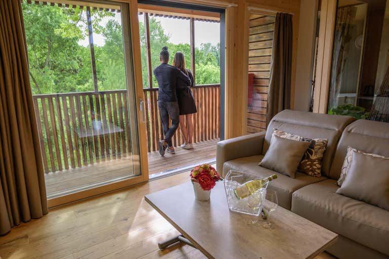 You will stay in a wonderful tree house: a suspended suite that is about 5 metres high and is built around the trunk of a large linden tree, which crosses the room in a scenic glass window. Inside you will find a king-size double bed, a living area with sofa bed, fridge, TV, safe and a relaxation area with shower and bathtub. The bathroom is en suite and equipped with a toilet, washbasin and shower. Courtesy kit, linen, bathrobes and hairdryer are included.