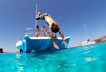 You will travel aboard BlueRoots, an 11-metre long and 5-metre wide sailing catamaran with a deck area of approximately 48 square metres, which can be sailed or motorised. The boat is equipped with a bathroom, a kitchen, a large dinette, two cabins, a climbing ladder, a bow completely covered with large cushions, and a stern with a comfortable sea-view lounge, dedicated to diving, fun, aperitifs and relaxation.