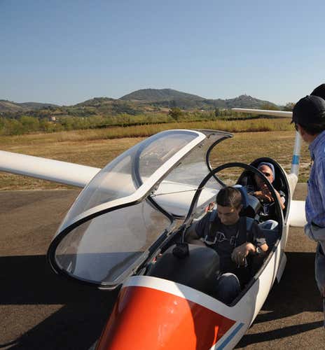 We will be ready to climb into the two-seater glider equipped with dual controls and fasten our seatbelts. We will take off thanks to an aircraft tow and, after reaching an altitude of about 750 metres, we will be able to start our descent using only the wind.