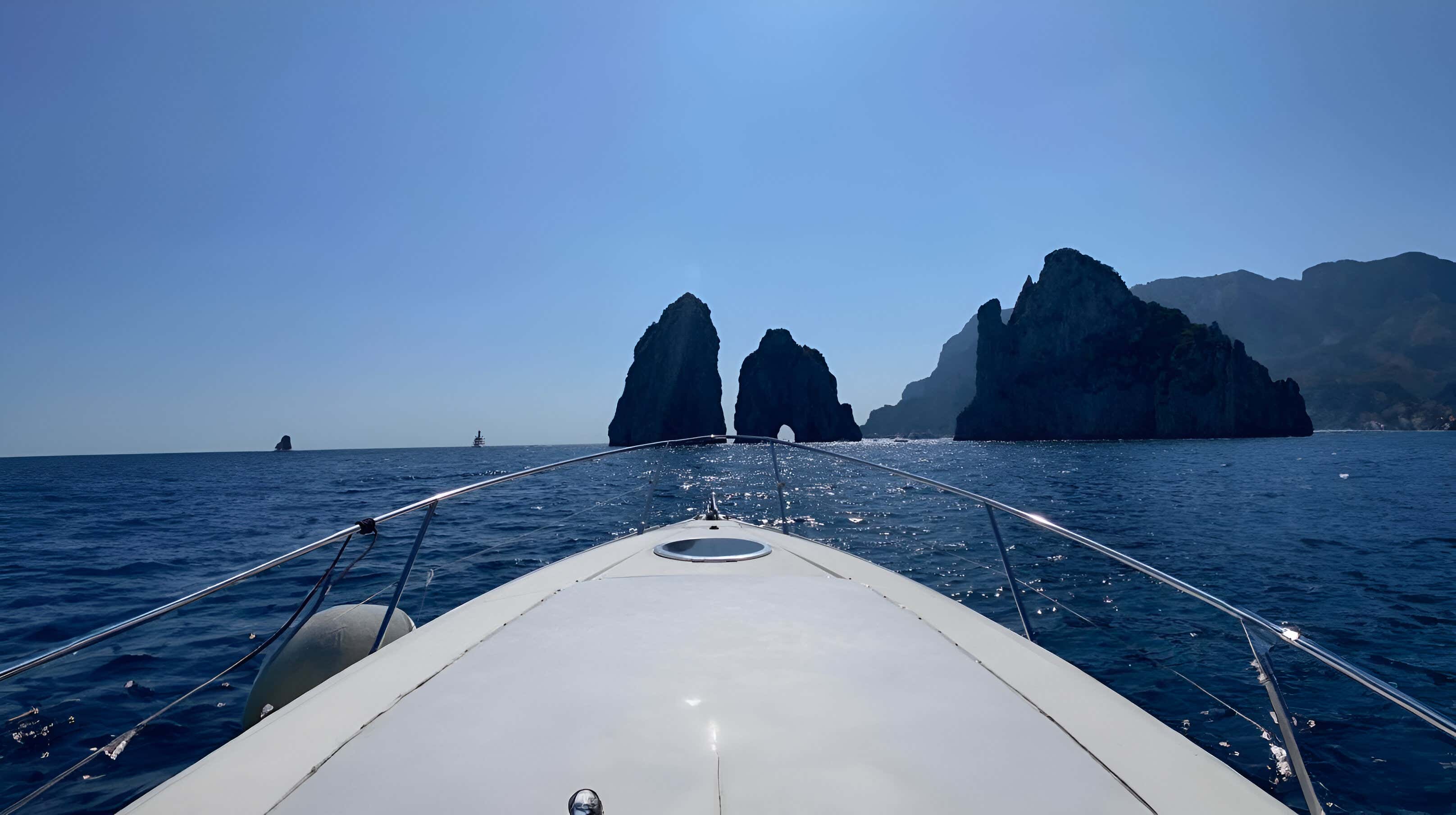 The tour takes place on board the Cranchi Acquamarina 31, a 10-metre motor boat, equipped with toilets, sundeck, table, sun shower, stereo, wi-fi, awning, fridge, gangway, two cabins, inflatable boats and snorkelling masks available for passengers.
