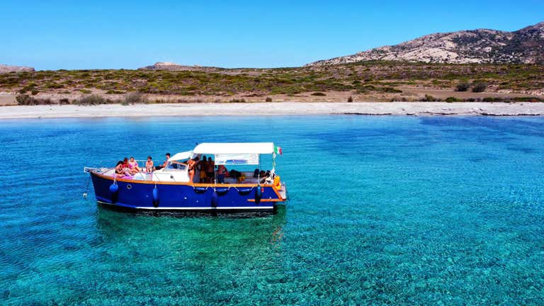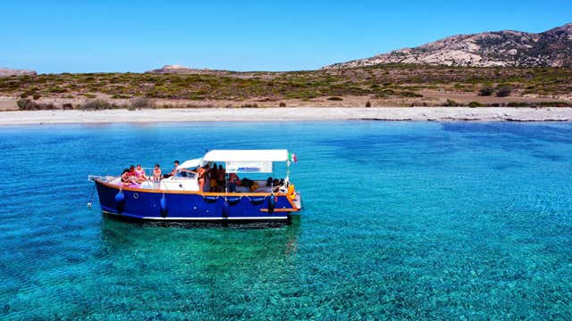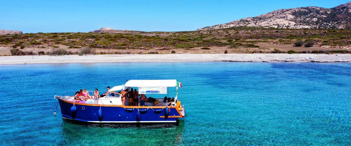 The boat intended for the tour is 10 metres long and is a modern motorboat with a wooden hull built in 2019. At the stern it is equipped with a large awning and sofas in which to sit and enjoy the excursion in comfort, while at the bow it is equipped with a sunbathing couch, a small beach for diving and a freshwater shower. The boat is completed by a galley, a cabin and a toilet. A 3-seater kayak and snorkelling masks are available on board.