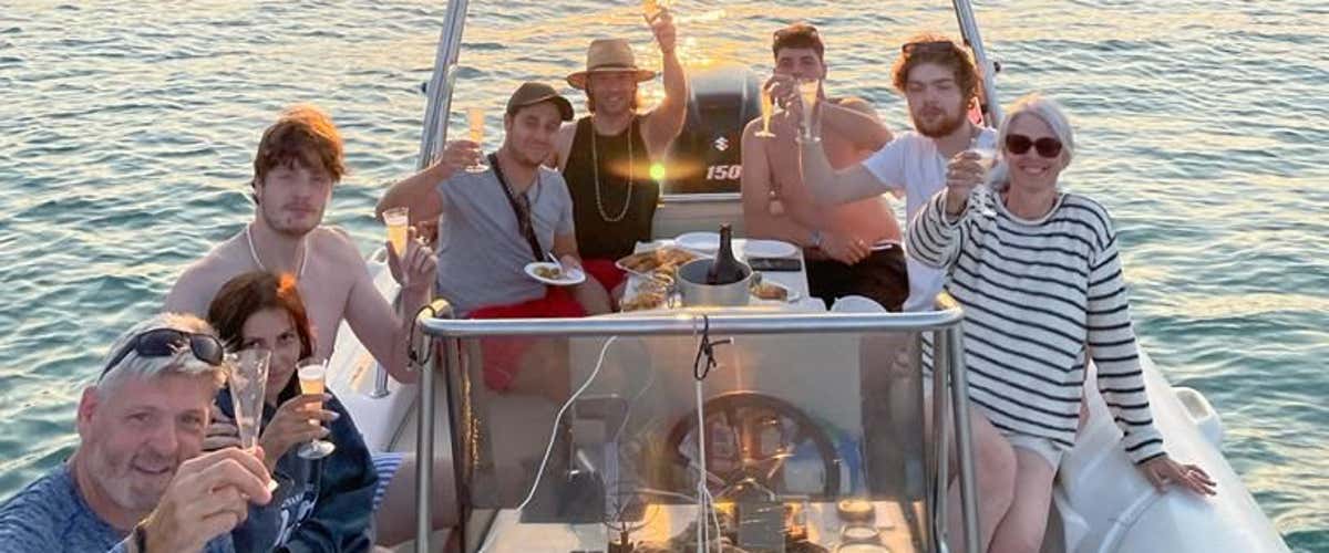 The boat used for the tour is an 8 m dinghy with a 150 HP engine, with ample space, comfortable seating, a large awning, shower and stereo.