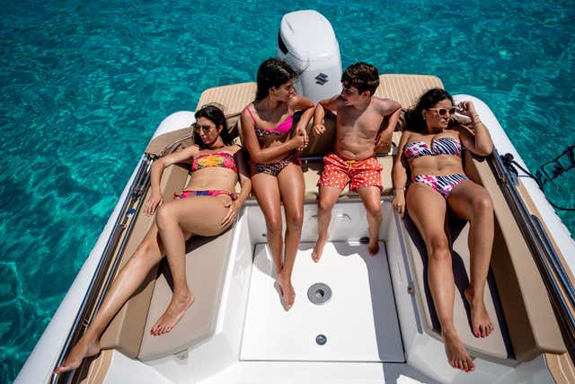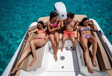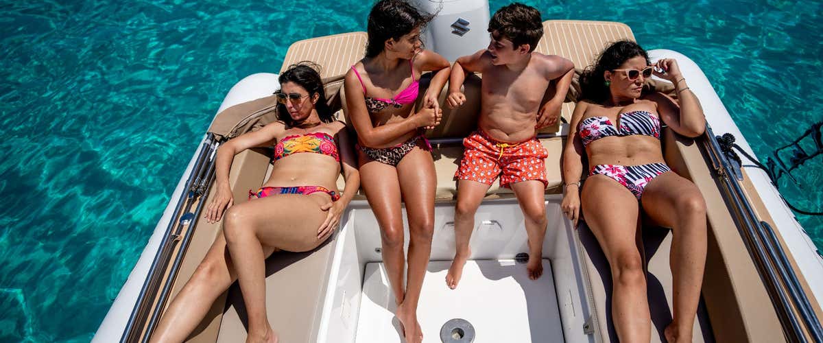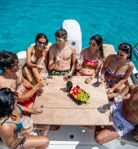 We will be on board the Pajara 28, a comfortable 8.90 m long dinghy with a large sundeck, comfortable dinette, bathroom cabin, awning and shower.