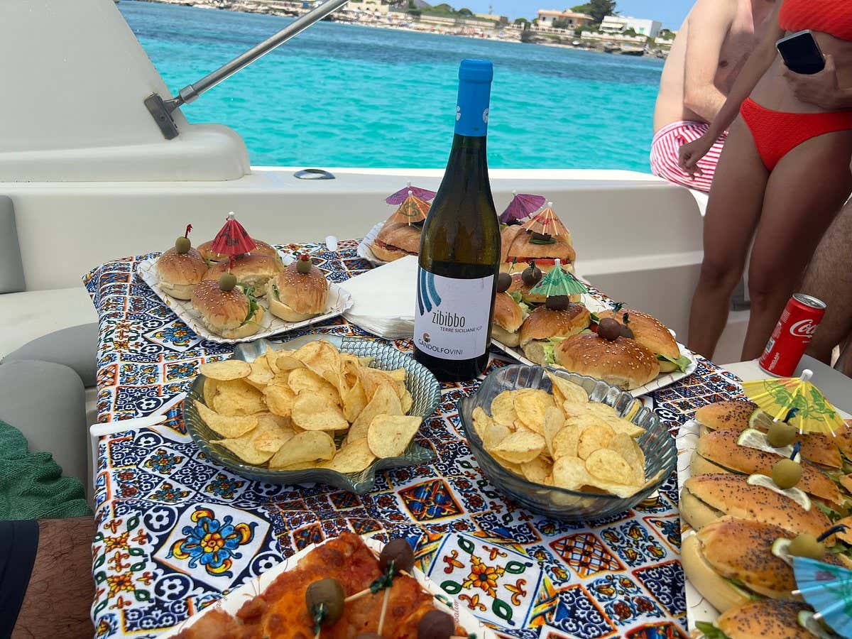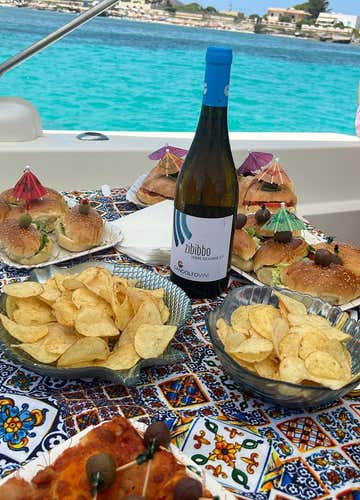 At around 12 noon, a rich aperitif (included) will be served on board: focaccia prepared by a local baker, local cured meats and assorted snacks prepared in house especially for you and your "crew". This will be followed by a wine tasting (included) by Cantine Gandolfo, to toast with your company: Grillo, Zibibbo and Amaro, expertly described by the skipper and wine and viticulture expert.