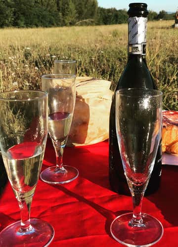 After about one hour of flight, it will be time to land. The wind conditions will determine the landing zone, which generally takes place on grass. Afterwards, we will find refreshments (included in the fee) prepared by the crew, including pastries, a plate of local cheeses and cold cuts, and a glass of champagne.