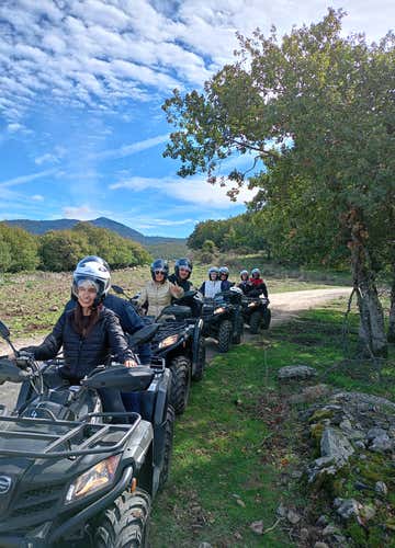 And here we are ready to saddle up and press the accelerator on our quad bike excursion. We will ride an initial stretch on asphalt and then venture onto dirt roads, penetrating the surprising Sardinian hinterland. We will speed through the natural setting of the thousand-year-old forest of Sos Nibberos until we reach the summit of Monte Rasu, at an altitude of 1,200 metres. We will continue exploring the area, encountering attractions such as Domus de Janas and nuraghi; there will also be points of natural interest such as natural springs and panoramic views.