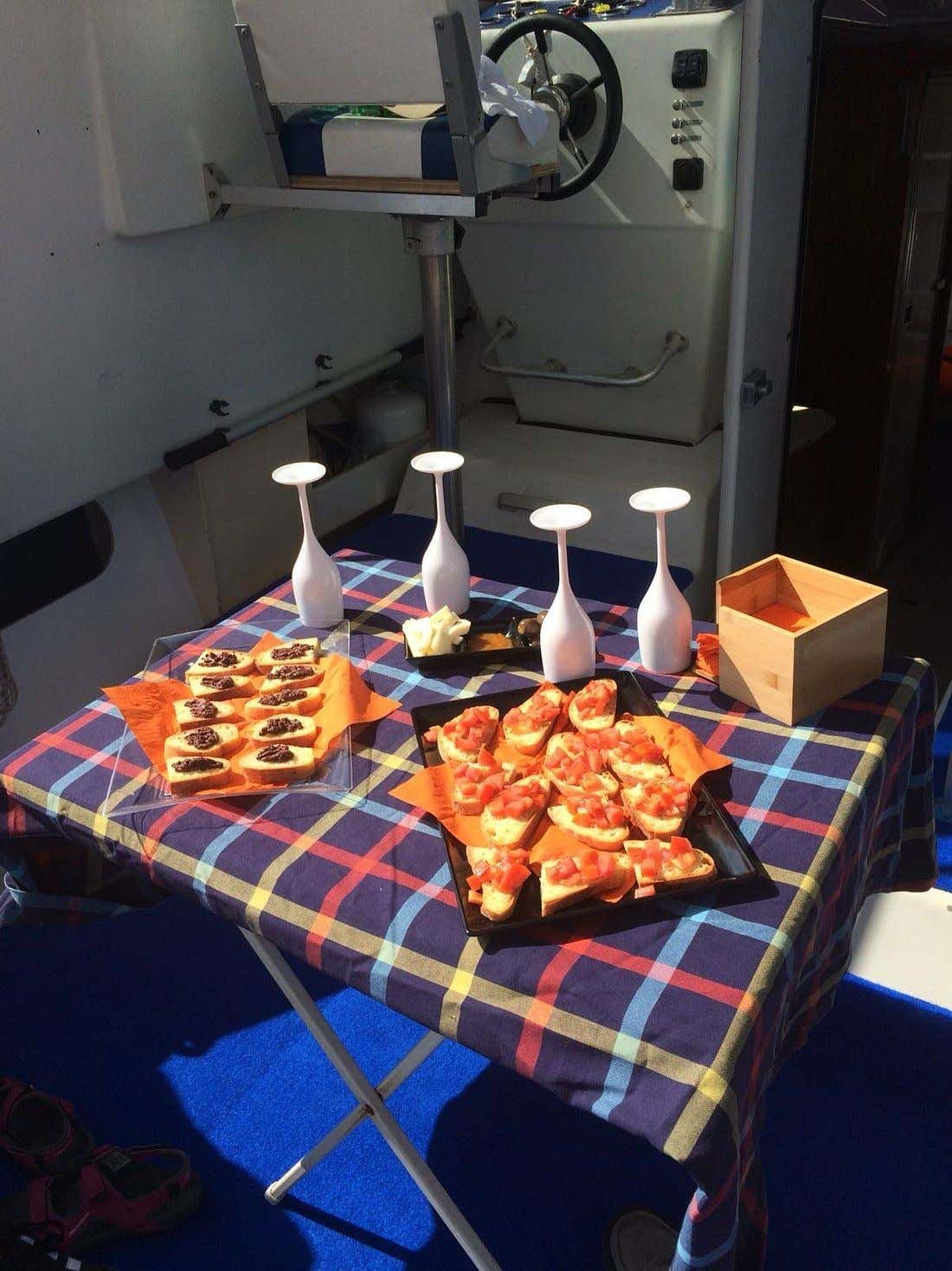 But the main attraction will be found on board: a vegetarian aperitif (included) will be served with bruschetta topped with tomato, olive pâté, cream cheese and whatever our land has to offer that day. All accompanied by background music via Bluetooth speaker that will start the party on board!