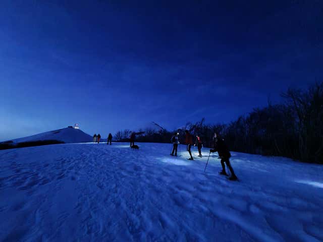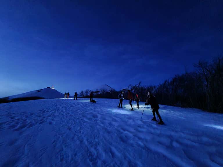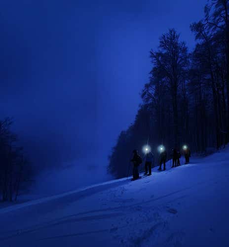 - Equipped with a torch and snowshoeing under a starry sky